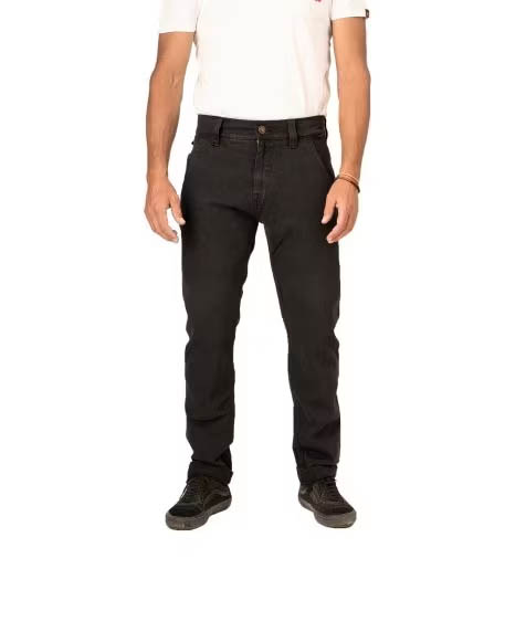 Le jean moto renforcé ressemble à un jean classique, mais il est équipé de fibres résistantes (Kevlar, Aramid) et de protections homologuées aux genoux et parfois aux hanches. Il est parfait pour un usage urbain et offre un bon compromis entre style et sécurité.